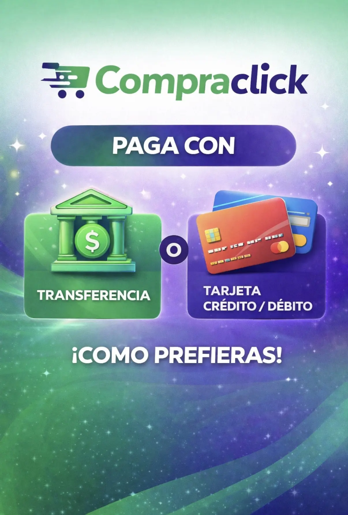 En CompraClick ofrecemos envíos gratis a todo el país, para que puedas comprar de forma simple, rápida y segura, sin costos adicionales. Además, brindamos múltiples opciones de pago para tu comodidad: transferencia bancaria y tarjeta de crédito o débito.